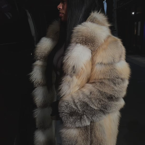 Model is wearing a size Large For a Oversized Look. This is a Golden Fox Fur Coat That is 120cm Long. This does not have a hood.