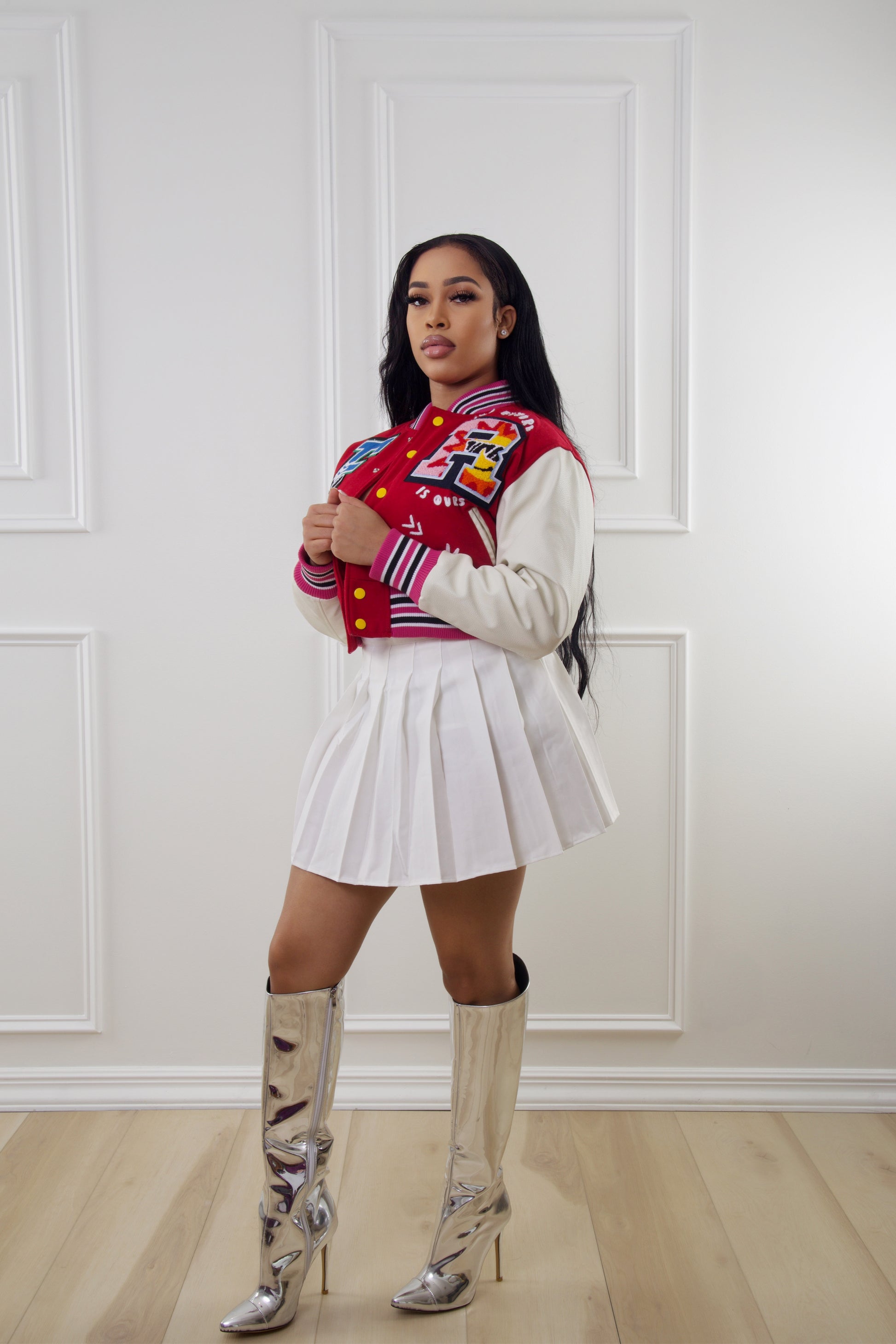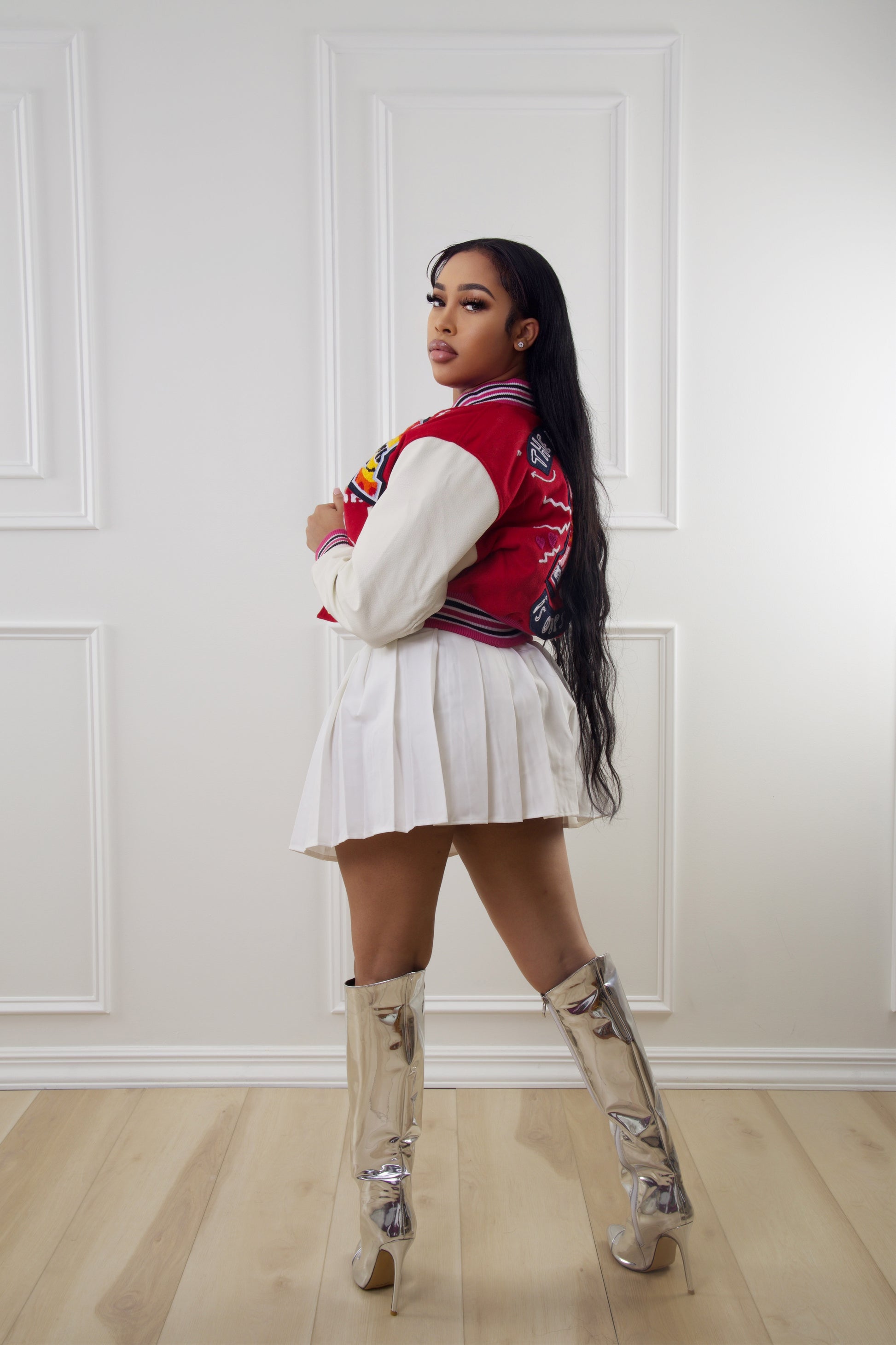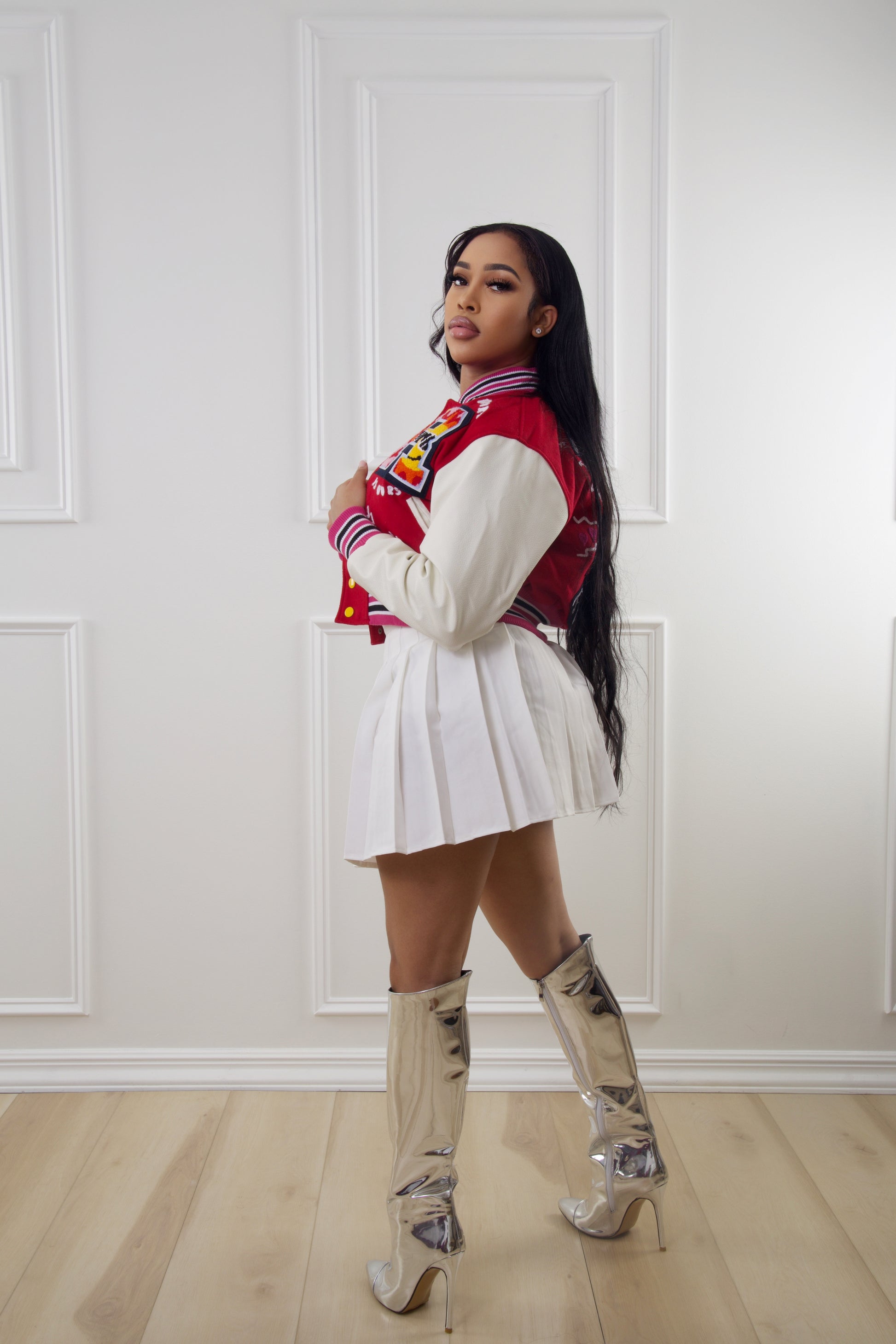 - We paired our white skirt with our Red Rich B*tch Varsity & Metallic Boots