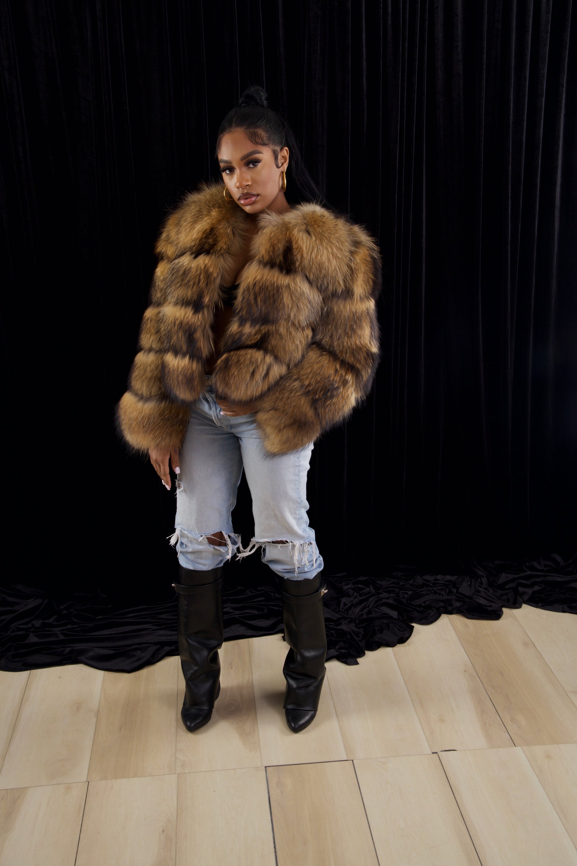This is a Raccoon Bomber with no hood. Model is wearing a size medium for an oversized look. Our Original Raccoon Fur Coat is a trendy coat that will have you feeling very sophisticated.